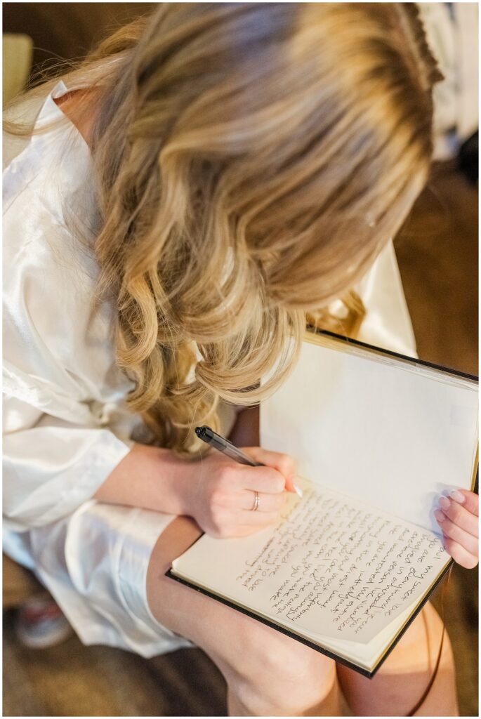 One of my favorite parts was when she copied her vows from her phone into the book their officiant would use during the ceremony. It was such a simple task, but it felt symbolic of the day itself: personal, unhurried, and full of meaning. Her mom helped with her dress, her bridesmaids added the finishing touches, and soon it was time to head to the First Look tucked just outside the cabins.