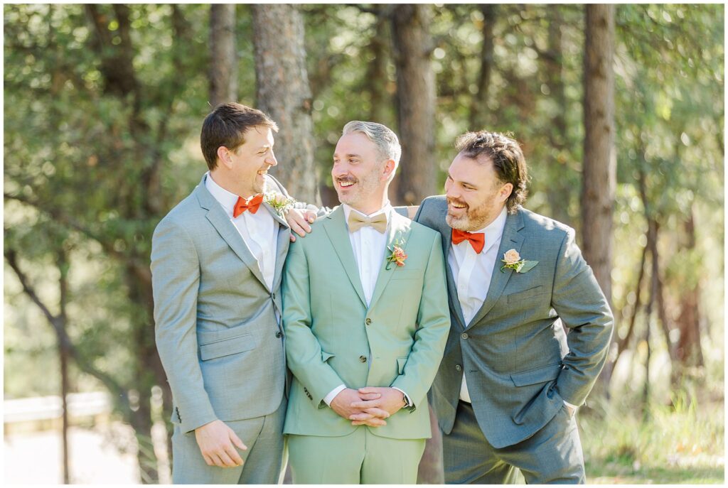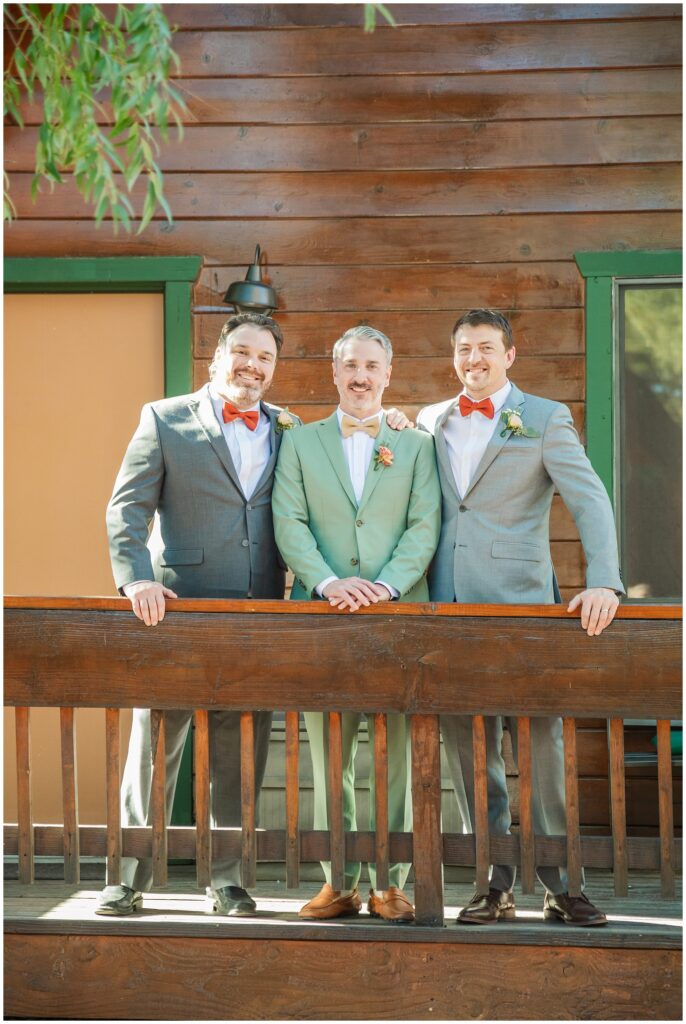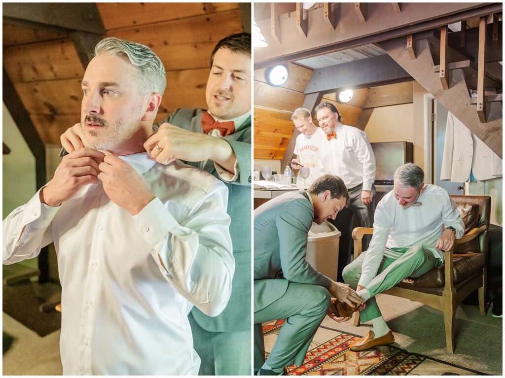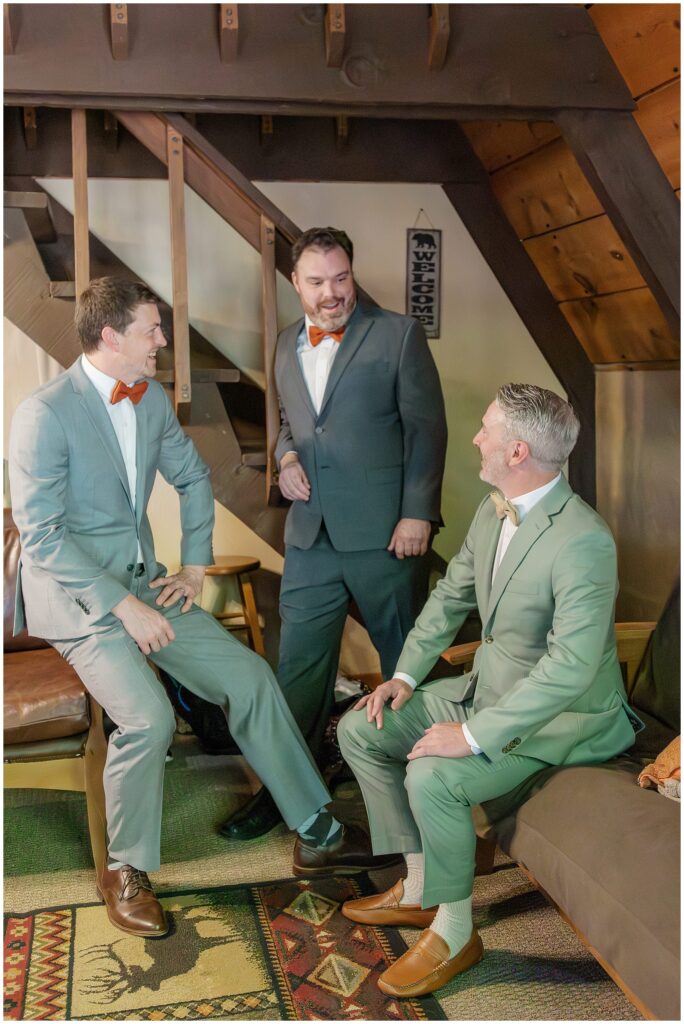 Over in another cabin, Paul was getting ready with his groomsmen. The morning felt relaxed and easygoing, with plenty of jokes and quiet focus as they helped each other with ties and jackets. His details were simple but classic, and the whole space had that calm energy that comes from being surrounded by good friends who know how to keep things light before a big moment.