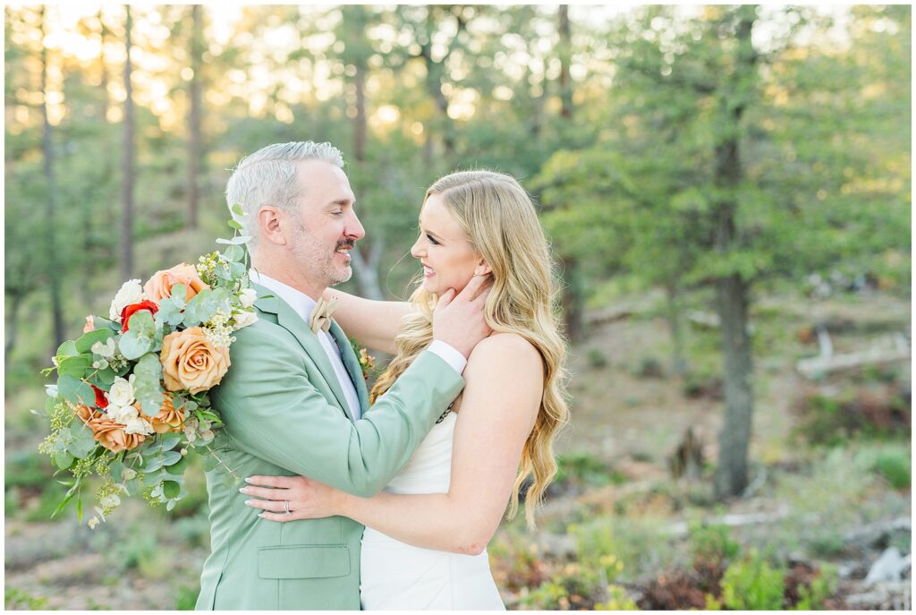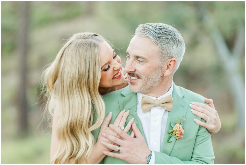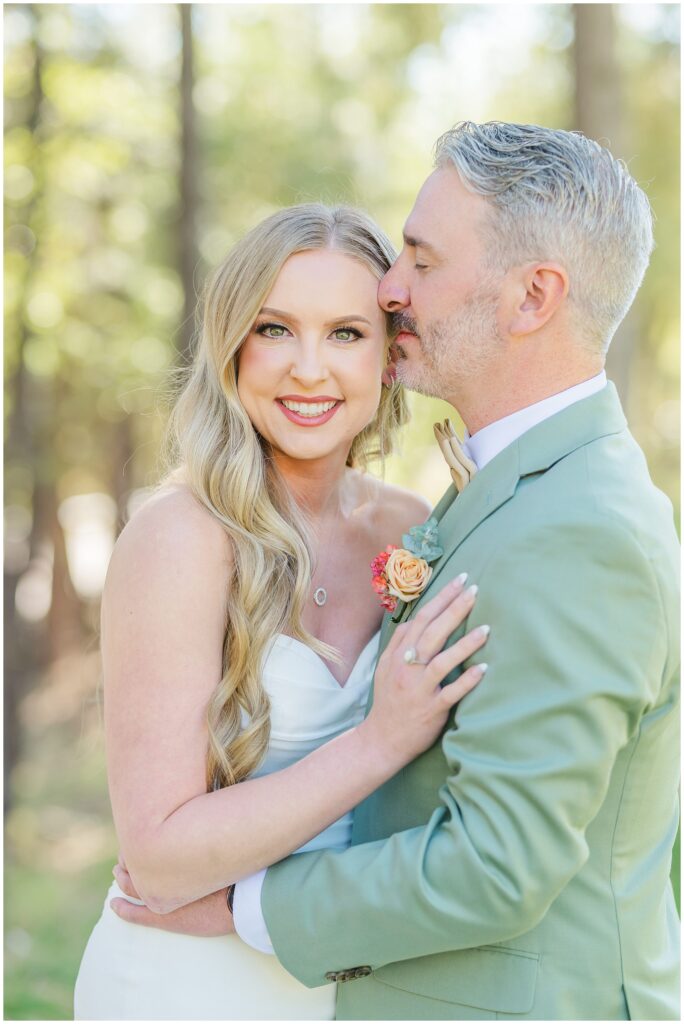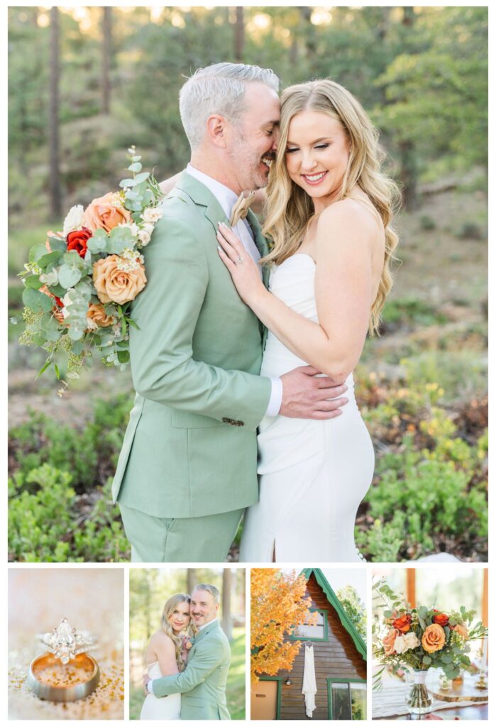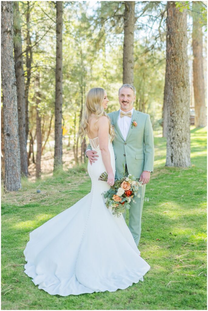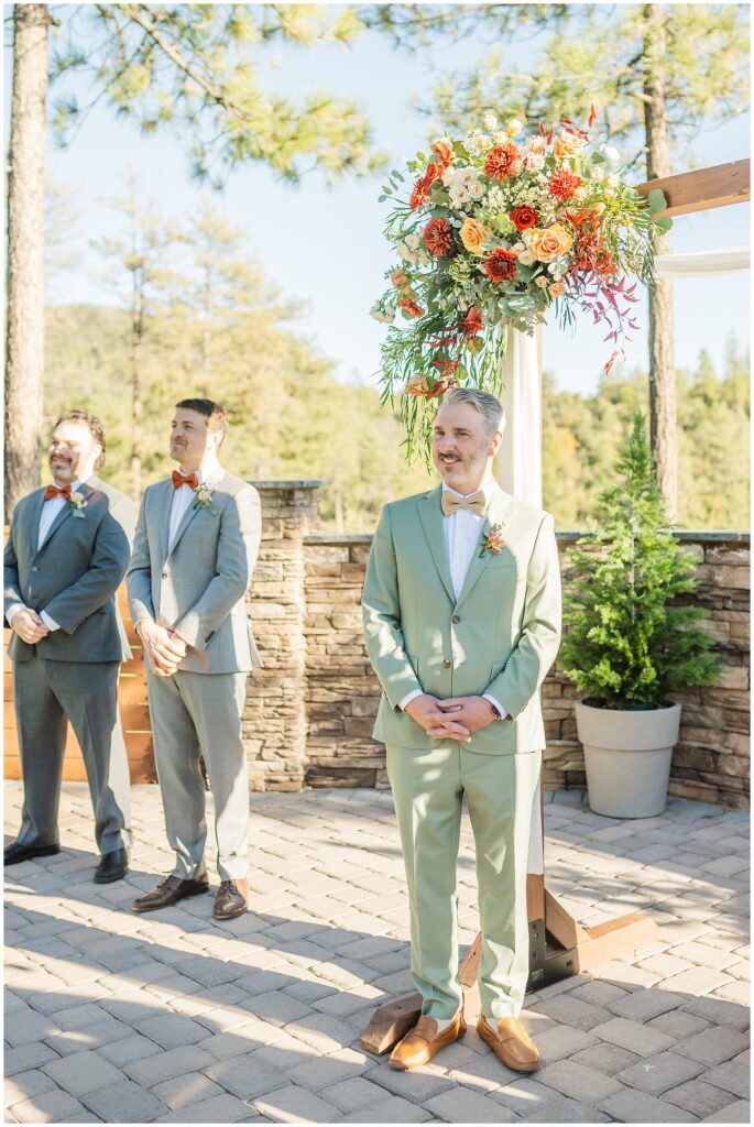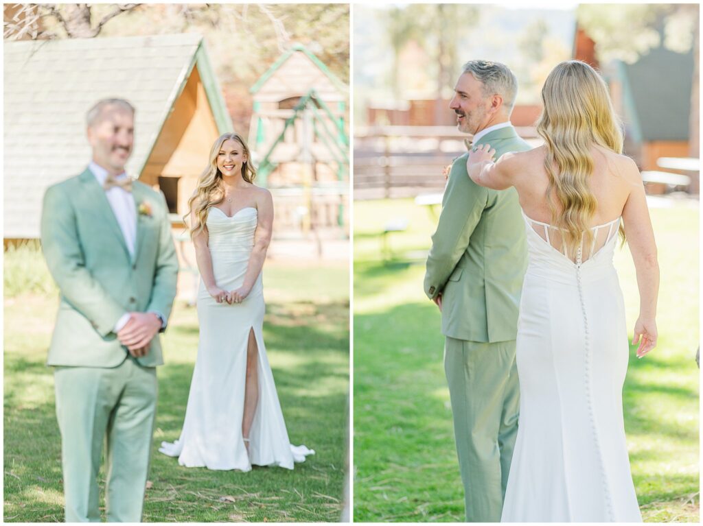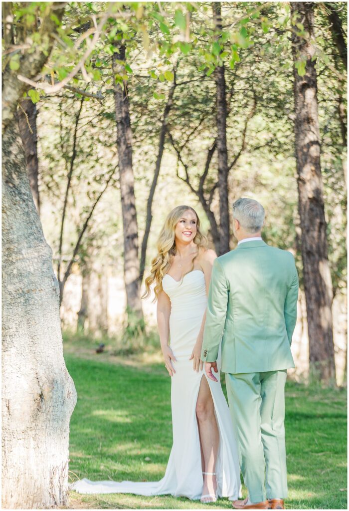 Once they were both ready, we headed outside for their first look among the pines. The cabins made the perfect backdrop for that moment, a mix of rustic charm, warm fall color, and the pines softening all sound. It was quiet, just the two of them, and you could see the nerves fade the second they saw each other.