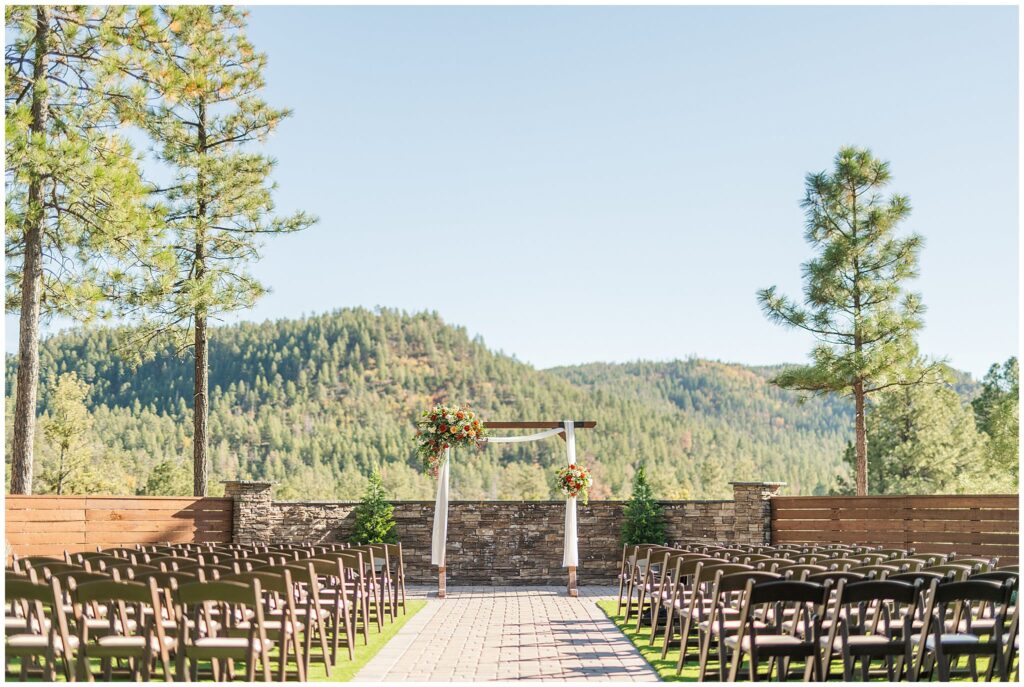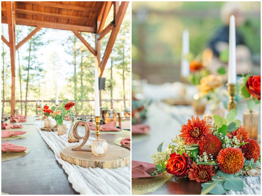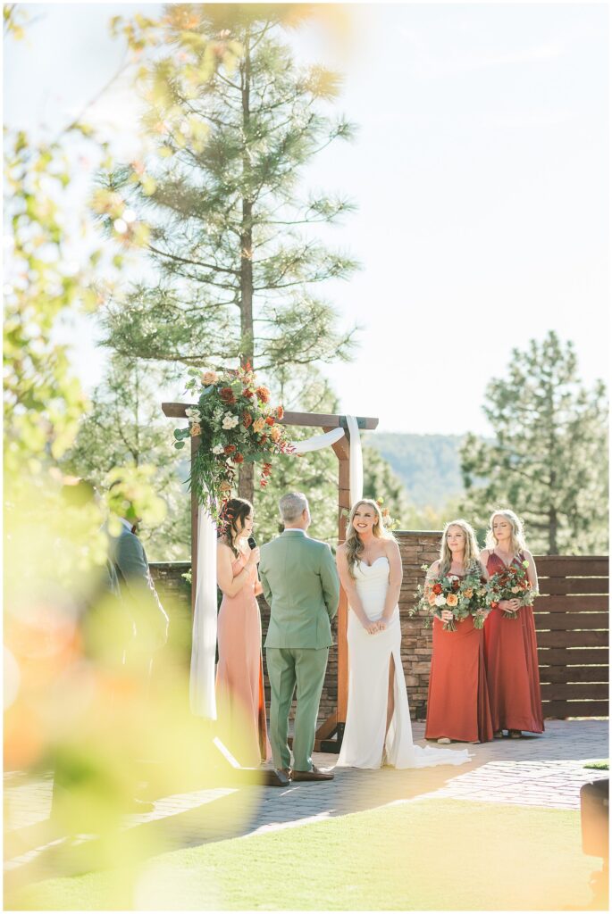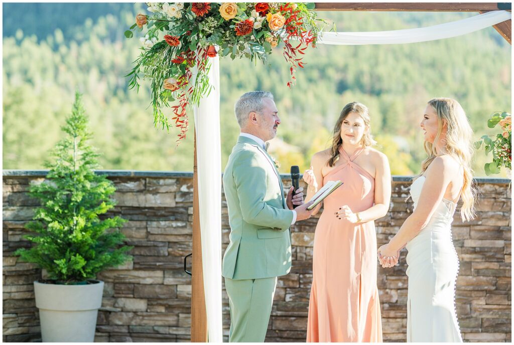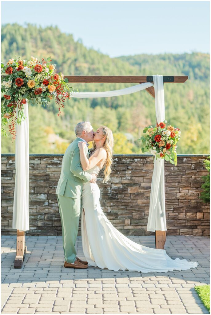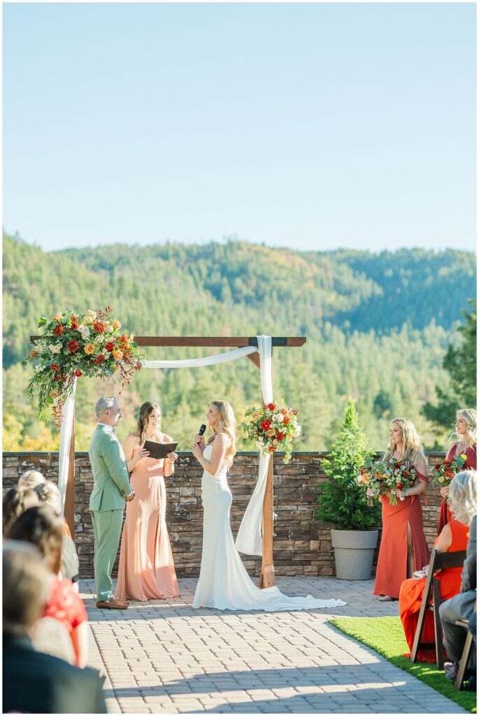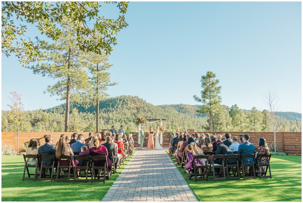Guests gathered for a ceremony that felt both relaxed and deeply personal. The floral design brought in just the right amount of color against the forest backdrop, and the mountain light filtered through the trees in that golden way it only does in fall. Kids played quietly in the back rows, friends smiled through tears, and every part of it felt like them.