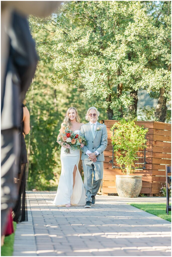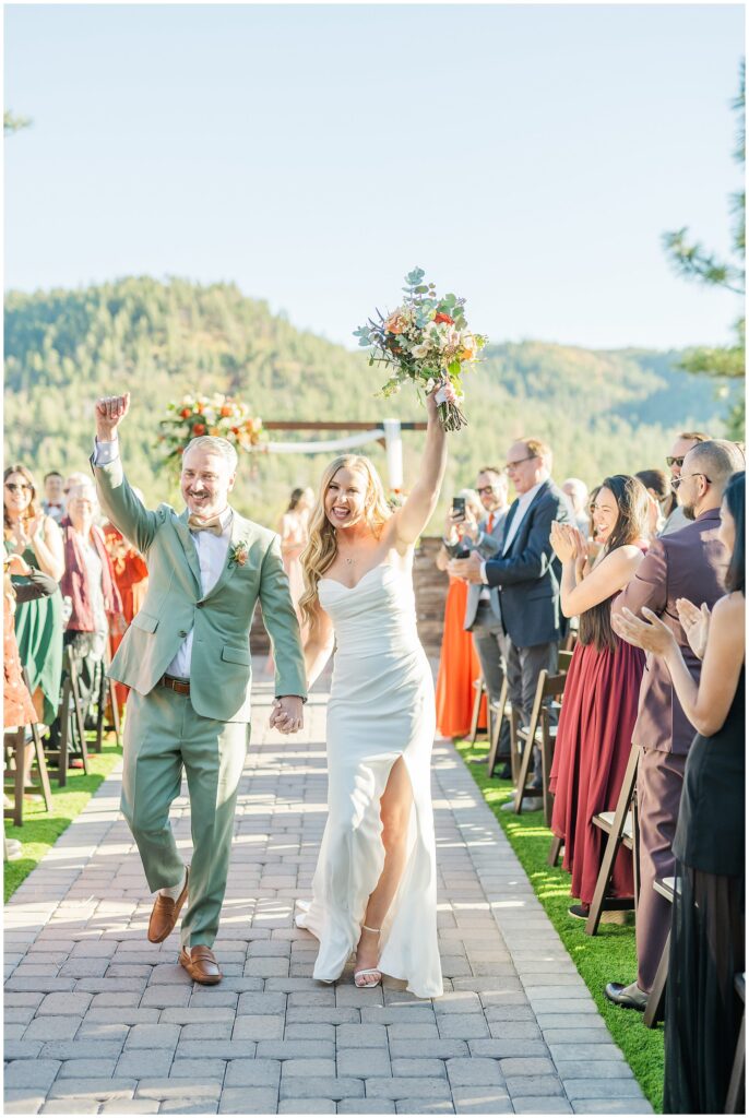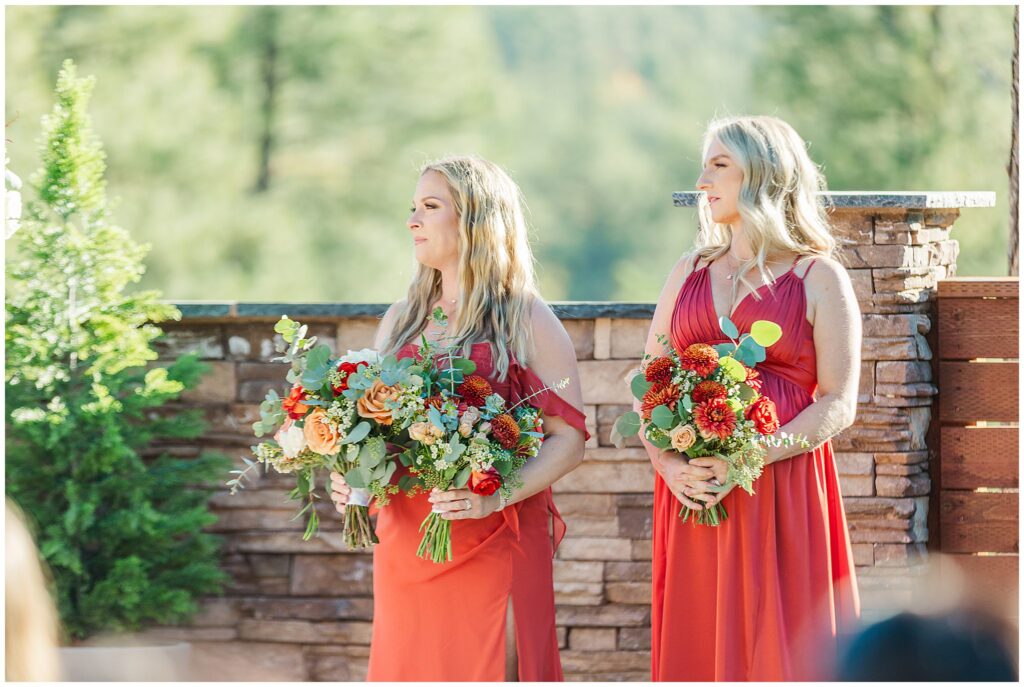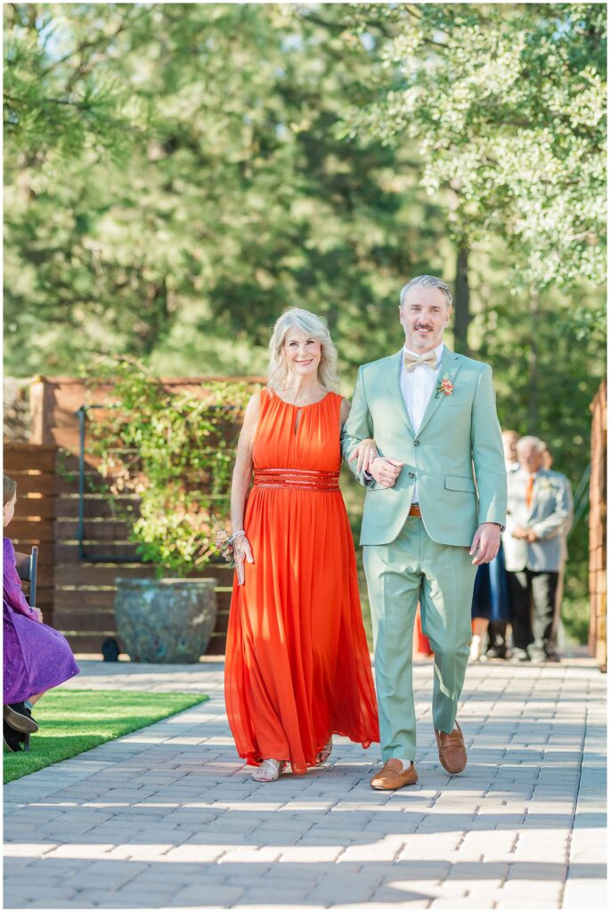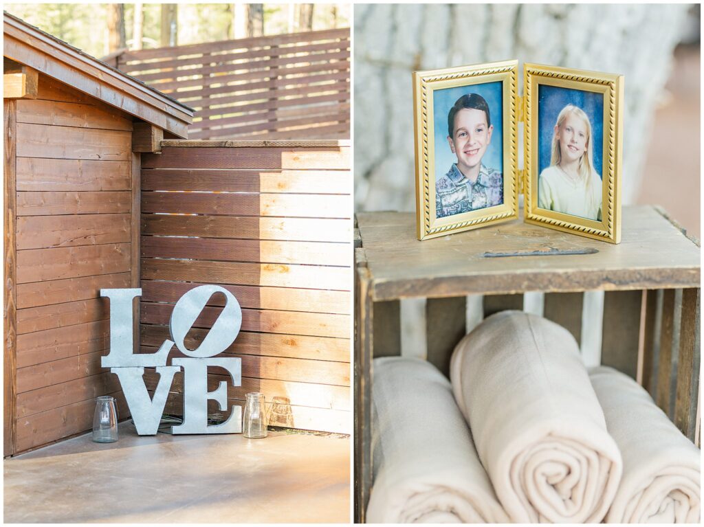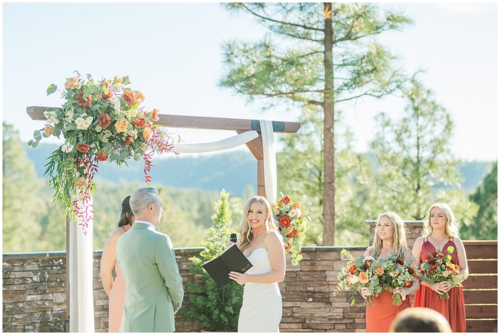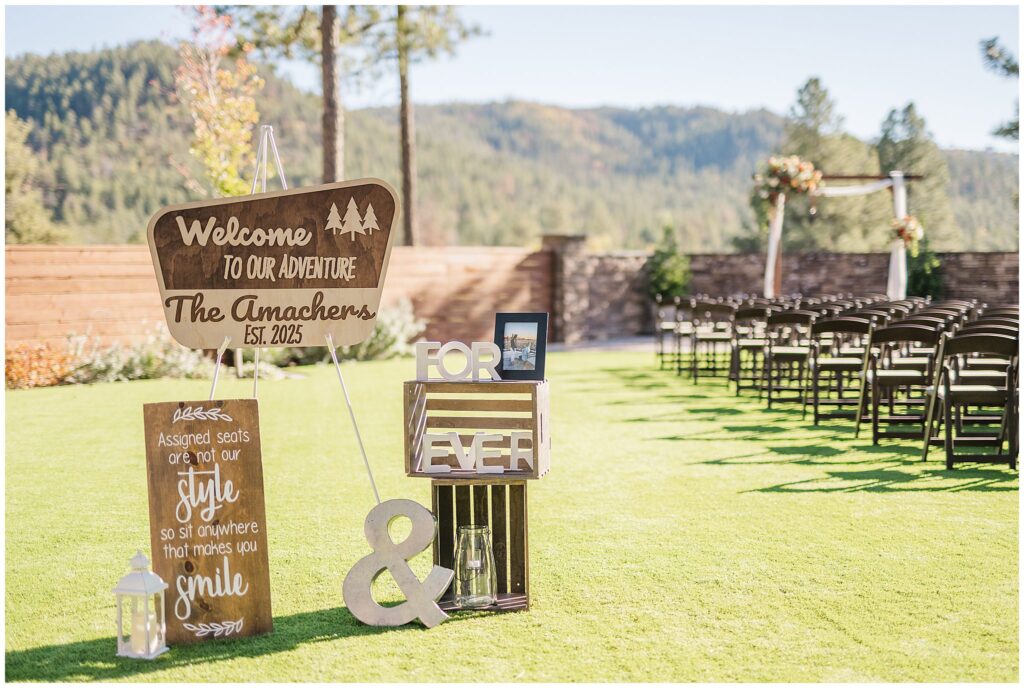 Guests gathered for a ceremony that felt both relaxed and deeply personal. The floral design brought in just the right amount of color against the forest backdrop, and the mountain light filtered through the trees in that golden way it only does in fall. Kids played quietly in the back rows, friends smiled through tears, and every part of it felt like them.