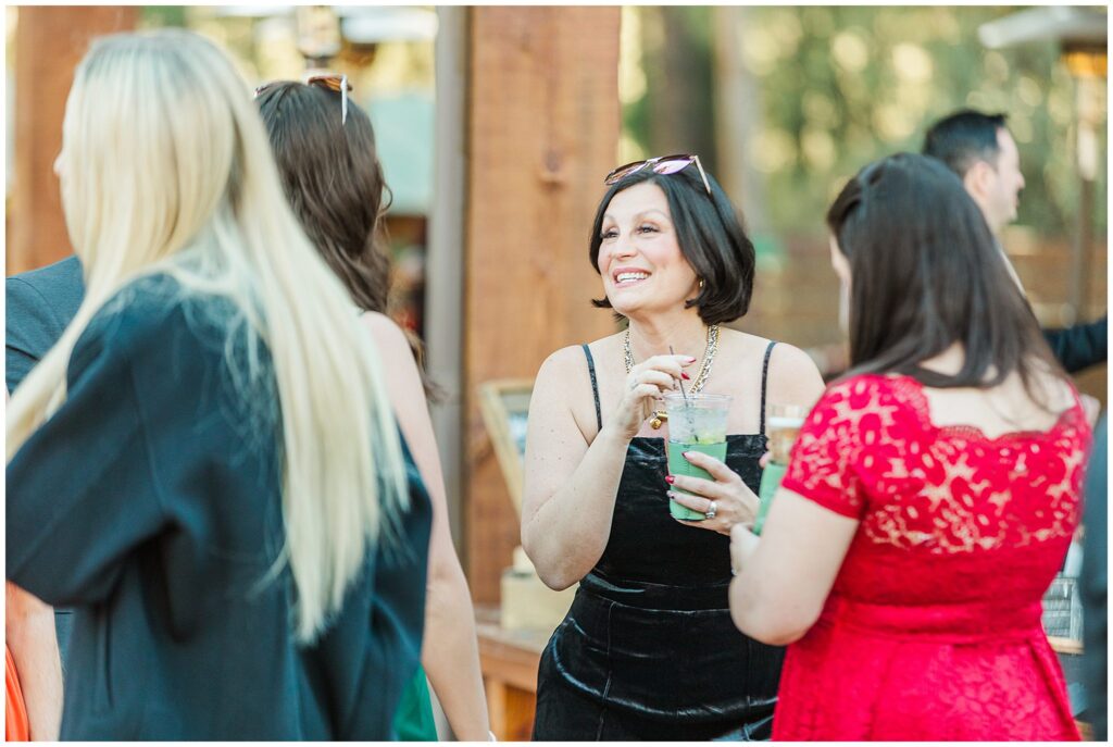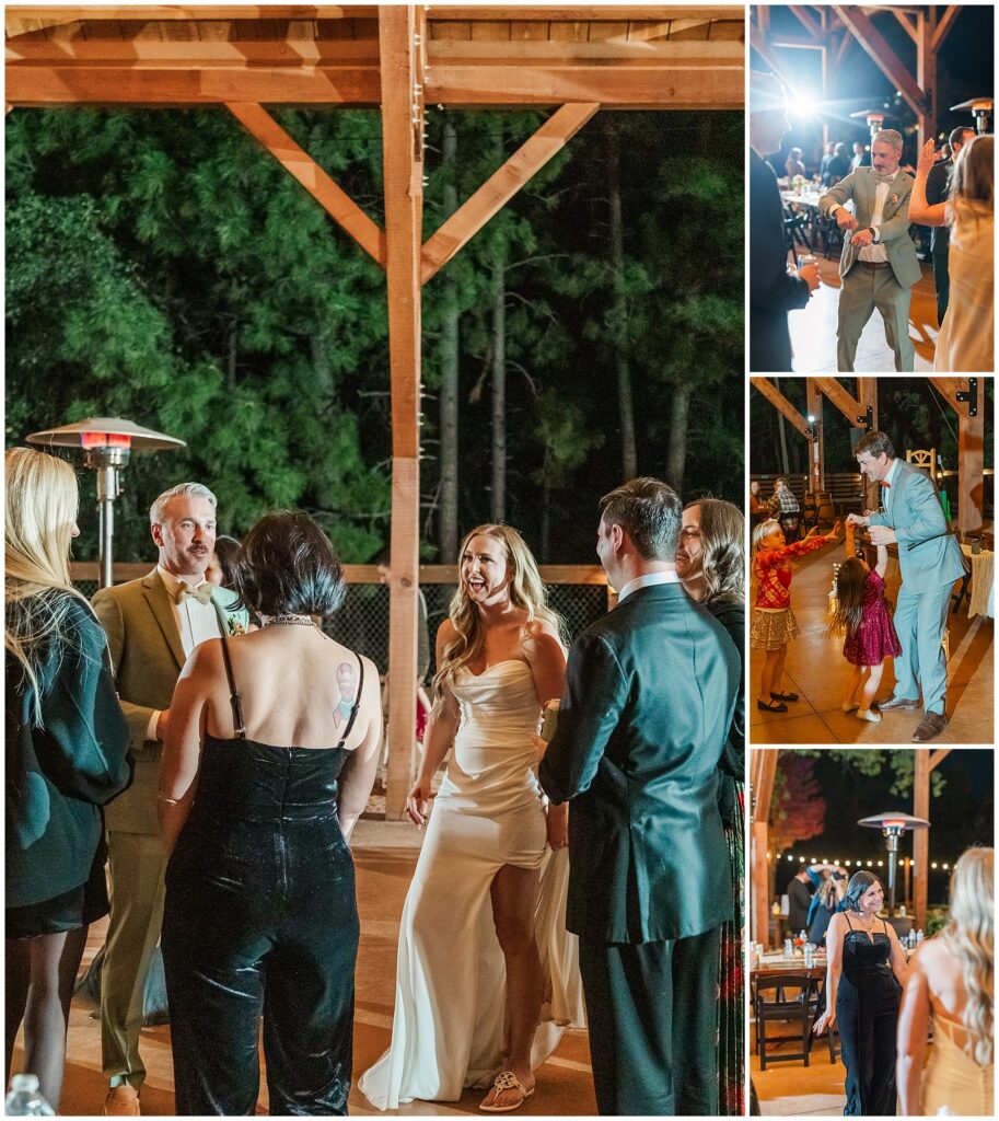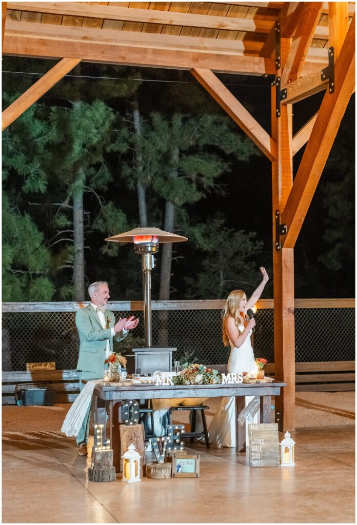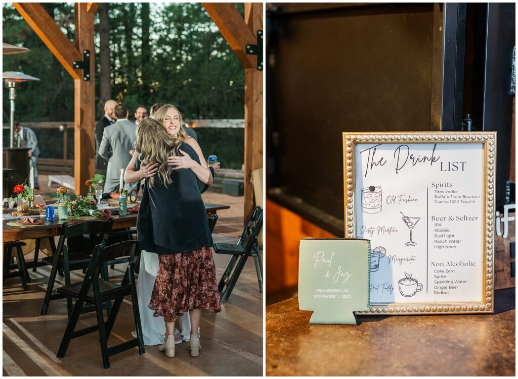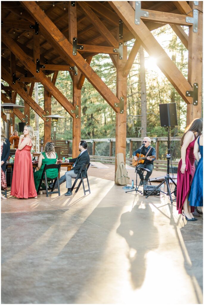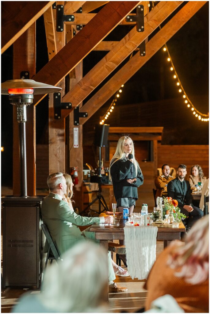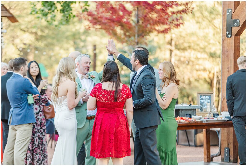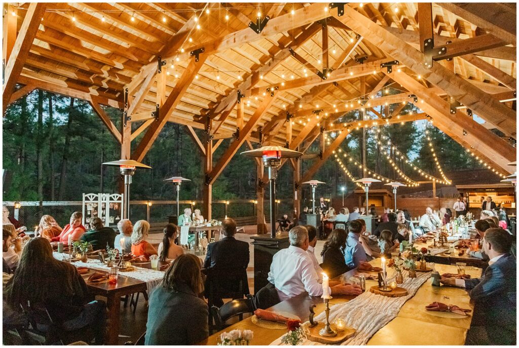 After the ceremony, Paul and Jazmin headed straight into cocktail hour to spend time with their guests. It’s not something every couple chooses to do, but it fit them perfectly. The whole evening had a laid-back, conversational feel, with the BEST guitar music playing softly in the background, friends gathered around the fire, and everyone lingering to enjoy the cool mountain air.